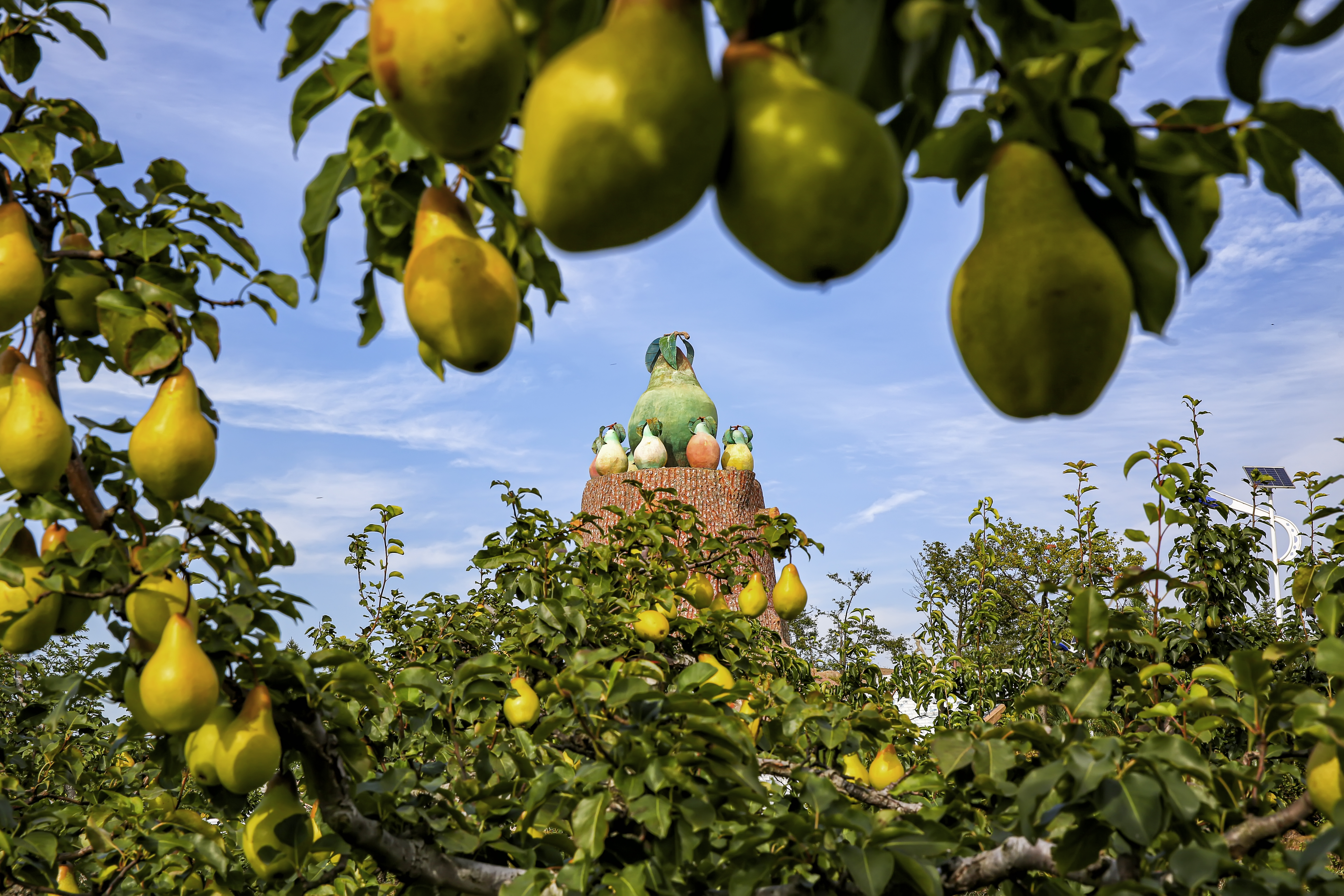 花果山廣場(chǎng)上有一棵高大的梨樹(shù),整體樹(shù)高19.9米,其中樹(shù)干高9.9米,梨高6.6米,它是花果山的標(biāo)志性建筑。游人來(lái)到這里可以進(jìn)一步了解大梨樹(shù)地名的由來(lái),同時(shí)也豐富了景區(qū)的文化內(nèi)涵。拾級(jí)而上,會(huì)看到一個(gè)小型的雕塑,一個(gè)人揮舞鐵鎬,站在刻著紅色干字的地球上,辛勤地勞作,象征著我們大梨樹(shù)人在改造生活的這片土地。